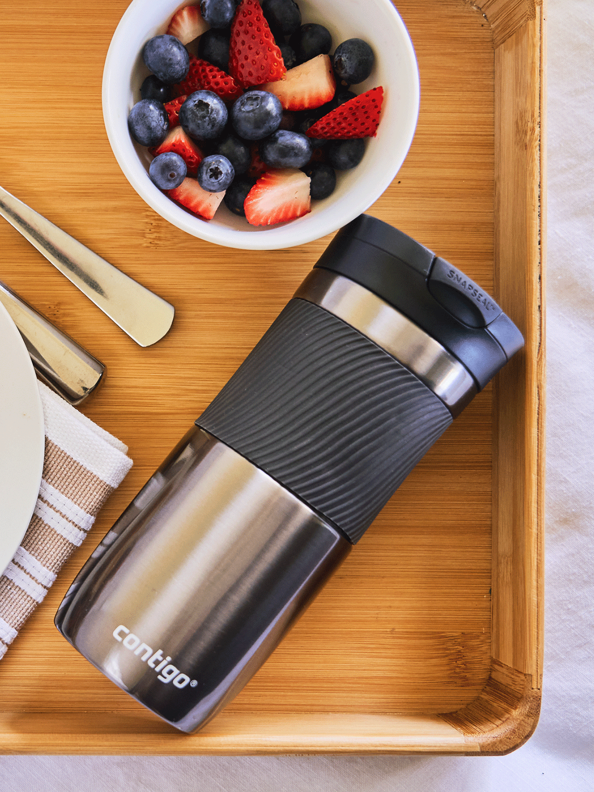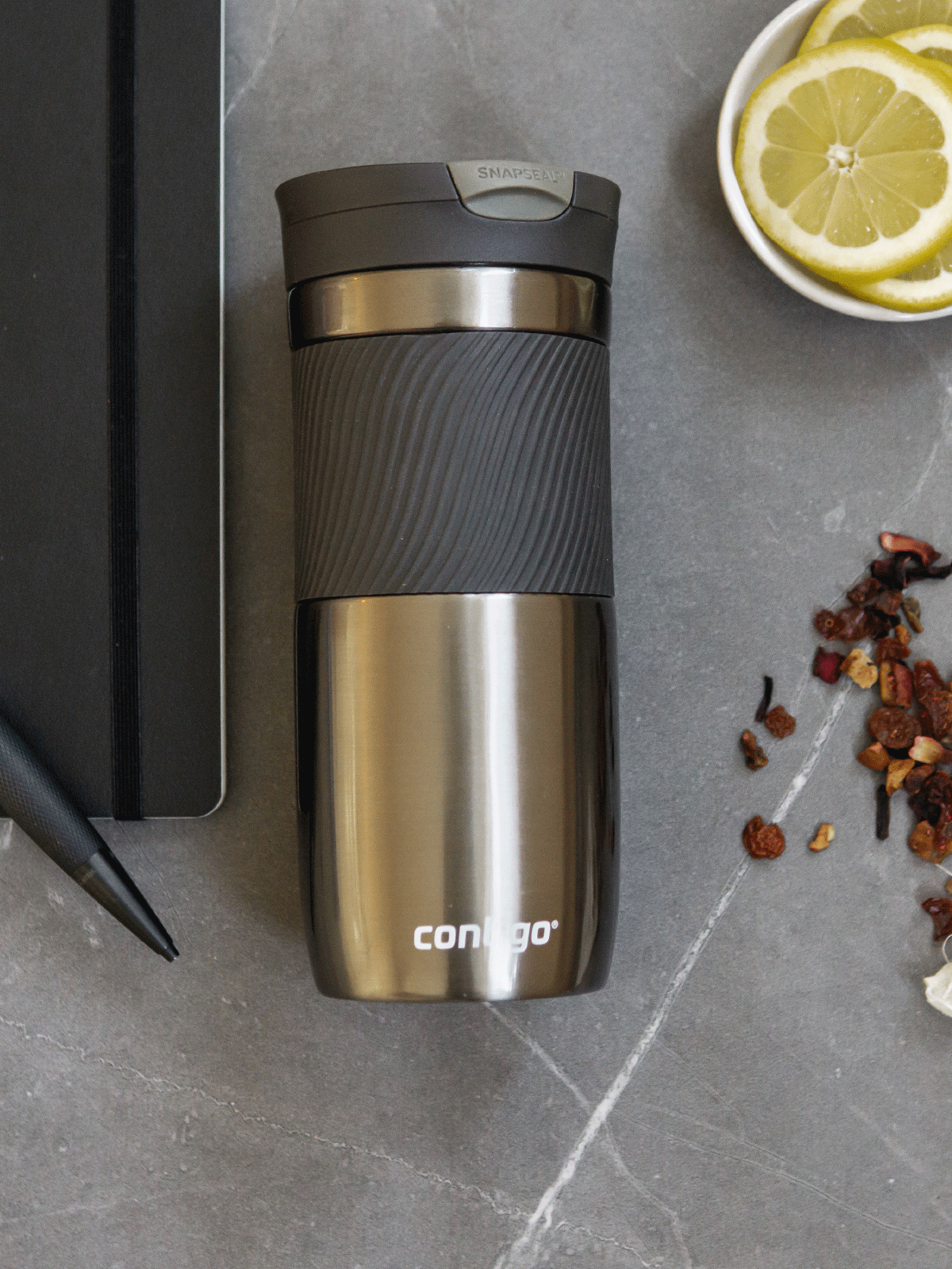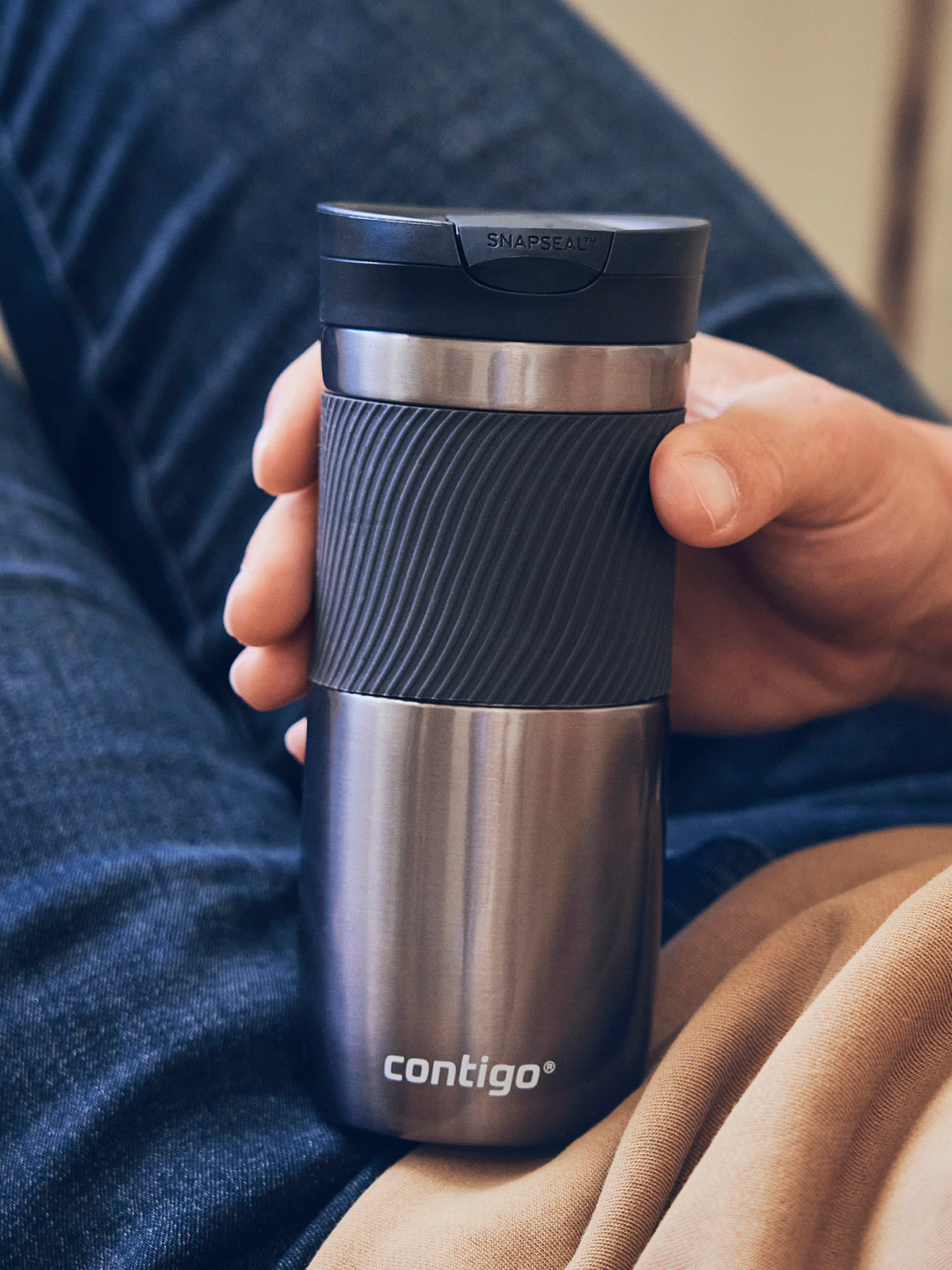 - ✅Contigo Byron Thermobecher aus Edelstahl mit Silikonband für sicheren Halt und komfortablen Gebrauch.