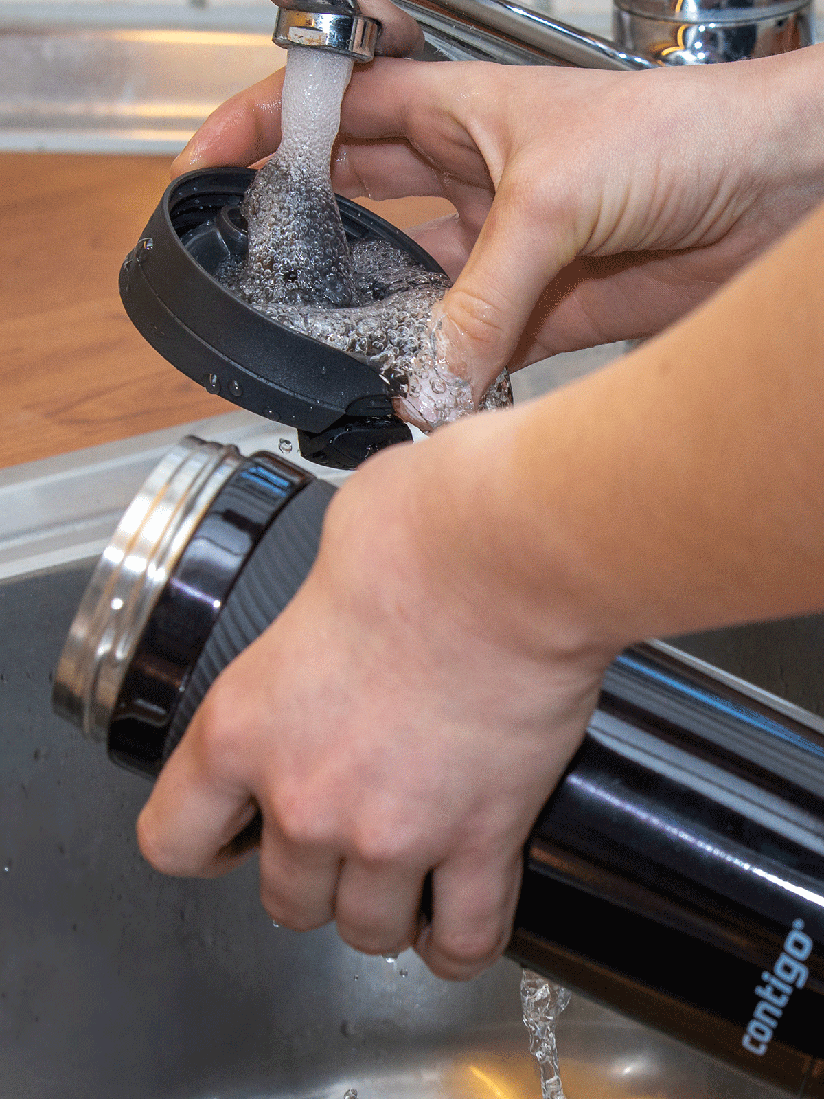 - Prüfen Sie vor dem Trinken, ob der Deckel richtig auf das Gehäuse geschraubt und zu 100 % festgezogen ist.