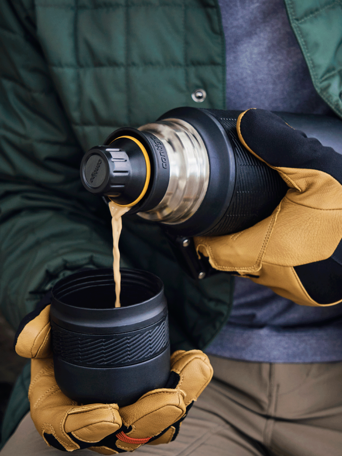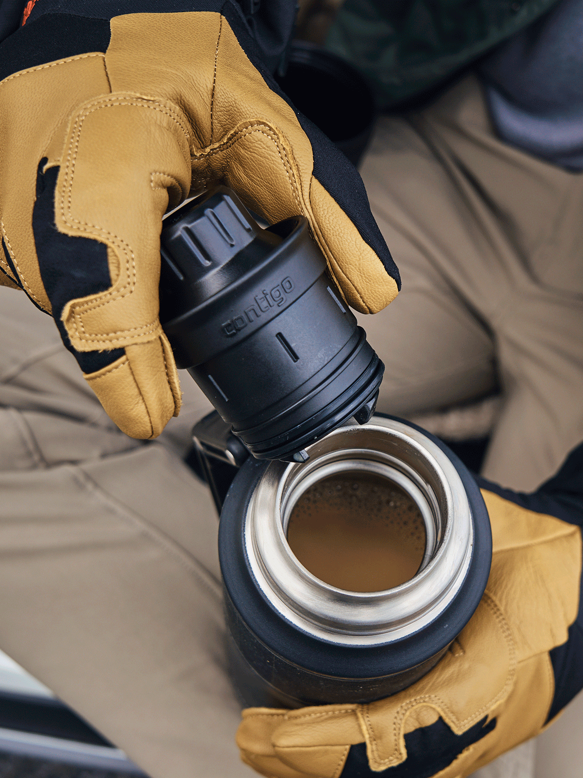 Eine gute Thermoskanne ist ein Produkt, das nicht versehentlich aus der Hand rutscht, selbst wenn sie nass ist oder Sie Handschuhe tragen. Wir haben die Contigo 740 ml Thermoskanne mit zwei weichen Silikonbändern ausgestattet. Eines befindet sich am Körper und das andere am Deckel. Dank dieser Bänder können Sie die Thermoskanne in jeder Situation leicht öffnen und sicher aus ihr trinken.